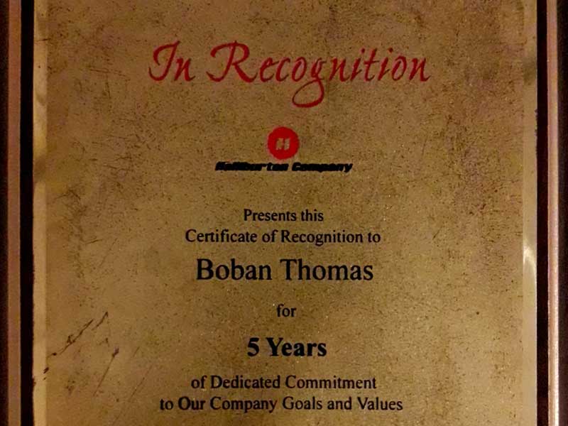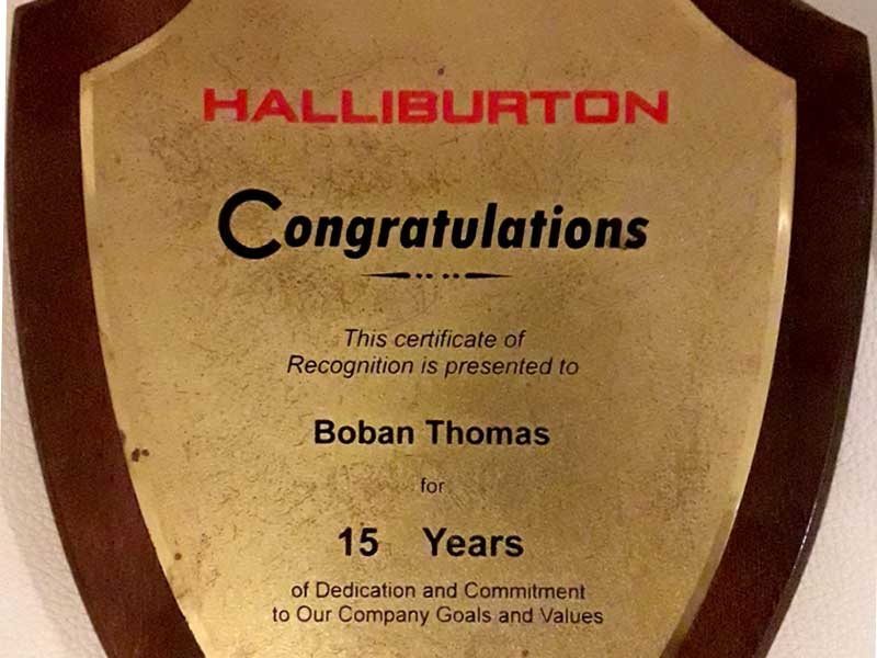 Mr. Boban Thomas had started his profession with M/s. Halliburton Energy services at the age of 23 as an employee from 1990 to 2005. He received best performance award from Halliburton Energy Service CEO. Halliburton Company is an American multinational corporation. It is one of the world's largest oil field service companies, it has operations in more than 70 countries. It owns hundreds of subsidiaries, affiliates, branches, brands, and divisions worldwide and employs approximately 55,000 people.